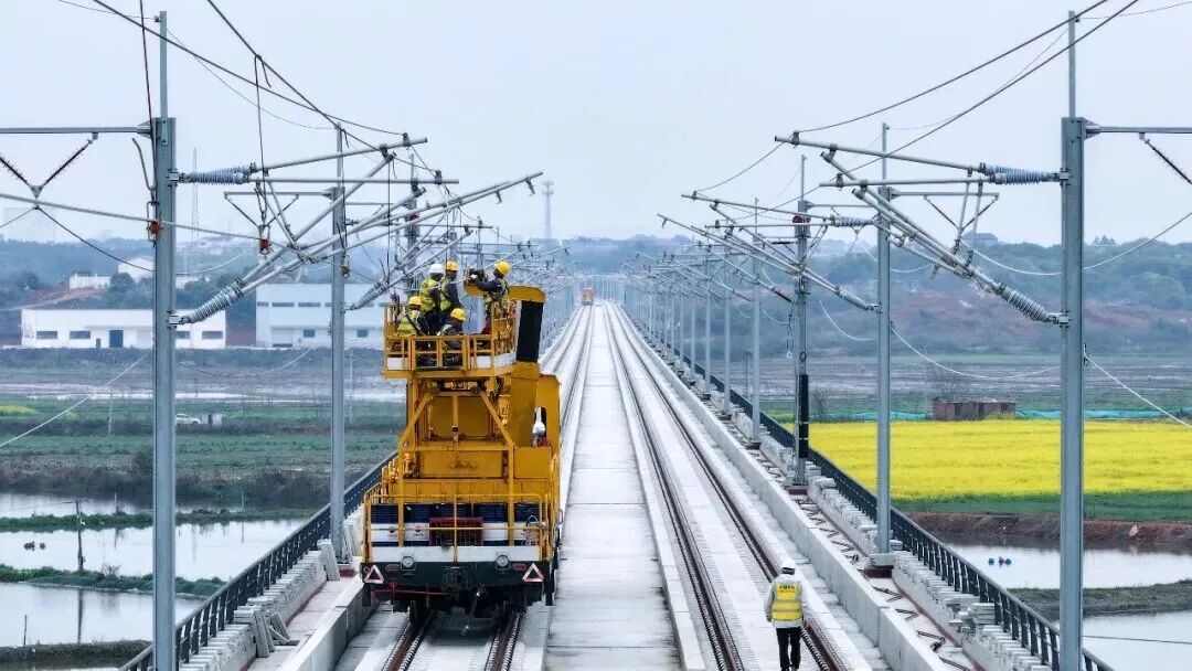 3月28日,在京港高速铁路南昌至九江段(以下简称“昌九高铁”)庐山南站至共青城东站区间施工现场,随着恒张力放线轨道车缓缓启动,首条接触网导线平稳架设到位,标志着昌九高铁全线接触网架设工作正式拉开帷幕,工程建设进入最后冲刺阶段。 接触网导线架设是高铁“四电”(通信、信号、电力和电气化)工程的关键环节,导线作为高铁列车的直接供电载体,其平直度、张力及空间几何参数直接关系到列车运行安全。 此次架设过程中,项目团队采用恒张力放线设备,通过实时监测并动态调整架线参数,将导线张力、平直度误差精准控制在0.1毫米以内。 为确保架设精度与施工安全,施工中项目团队采用建筑信息模型(BIM)技术对接触网架设区段进行预先识别,有效规避线索交叉施工风险点,确保接触网导线施工安全。 昌九城际铁路公司昌九指挥部副指挥长喻宇表示,接触网导线架设是昌九高铁建设从线下工程逐步转入线上电气设备安装的关键阶段。后续将科学组织施工,确保架设任务按期优质完成,为联调联试奠定基础。 按照施工计划,昌九高铁全线将完成335.4条公里的接触网导线架设任务,预计今年6月中旬全部完成。昌九高铁于2022年9月开工建设,预计于2027年3月具备开通运营条件。 新建京港高速铁路九江至南昌段(简称“昌九高铁”)位于江西省境内,北起九江,南至南昌,是国家《中长期铁路网规划》“八纵八横”高铁主通道之一京港(台)通道的关键区段,也是国家“十纵十横”综合运输大通道中福银综合运输通道的组成部分,同时也是江西省“市市通高铁”的最后一个项目。 正线全长137.7公里,设计时速350公里。线路从九江市庐山站引出,向南经庐山市、共青城市、永修县、昌北机场,终至南昌市,引入杭昌高铁黄昌段南昌东站,全线桥隧长89.13公里,桥隧比82%,是目前江西省高铁中桥隧比最高的线路。 全线共设站5座,分别为庐山站、庐山南站、共青城东站、昌北机场站、南昌东站。其中,新建庐山南、共青城东、昌北机场3座车站,改建庐山站和南昌东站。项目全线预计2027年3月开通运营。 昌九高铁建成通车后,我国南北向高铁运输通道将进一步完善,南昌至九江通行时间将从当前1小时左右压缩至半小时以内,为两地群众出行和区域经济协同发展提供有力支撑。 同时,京港大通道将全部贯通,进一步完善我国高速铁路网布局,加强长江中游城市群、环鄱阳湖城市群与长三角、粤港澳周边城市群的互联互通,提升区域交通基础设施水平,促进中部地区崛起战略实施、提升沿线城市形象和竞争力,对江西省打造“昌九一体化”综合交通运输体系、进一步对接融入粤港澳大湾区、助力长江经济带发展、推动沿线经济社会高质量发展具有重要意义。